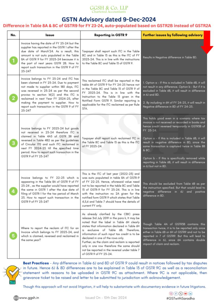 The much-awaited advisory from the Goods and Services Tax Network (GSTN) has been released regarding the difference in values between Table 8A and Table 8C of GSTR-9 Annual Return for FY 2023-24.