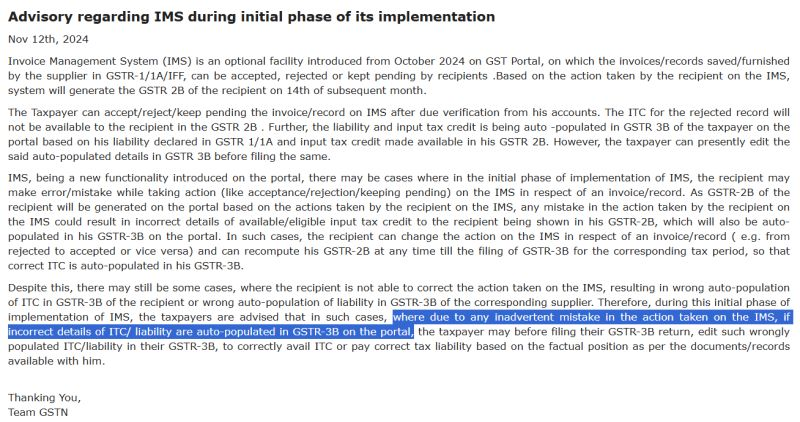GSTN Advisory on IMS and ITC Reporting