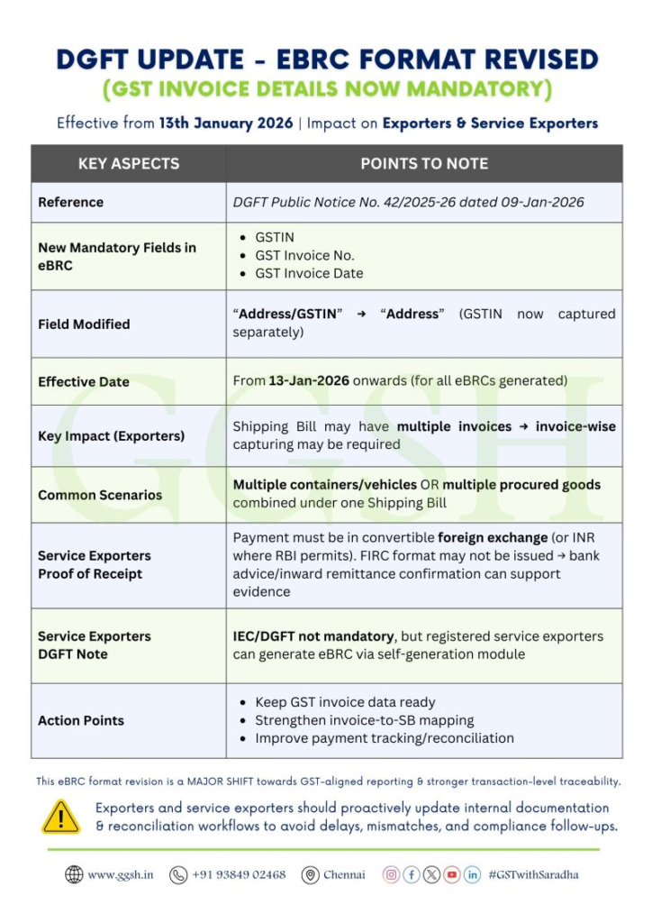 Effective 13th January 2026, the eBRC (Electronic Bank Realisation Certificate) format has been revised—bringing GST into sharper focus by mandating invoice-level reporting.