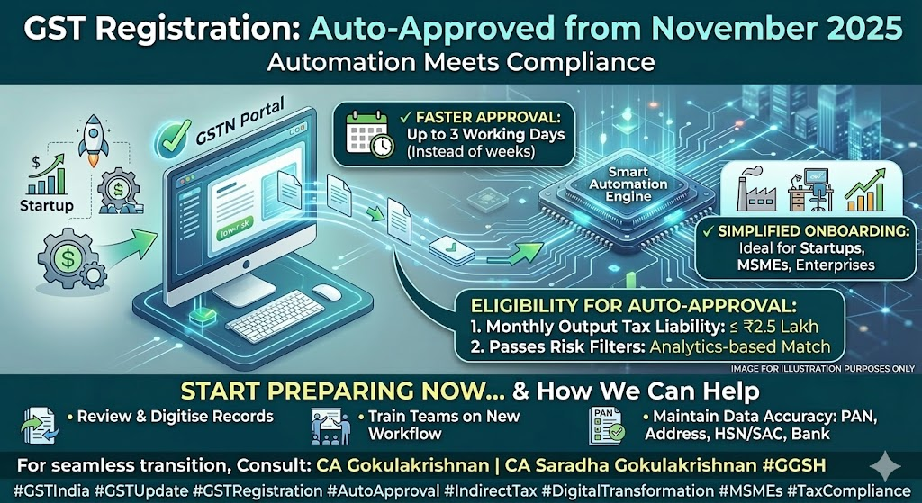 India’s GST ecosystem is moving toward greater automation and data-driven compliance. A major reform in the GST registration process will come into effect from 1 November 2025, enabling auto-approval of GST registration applications for low-risk taxpayers.