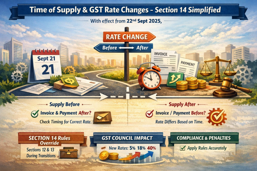 GST rate changes often create transitional complexities for businesses. Section 14 of the CGST Act plays a critical role in ensuring consistency and clarity during these periods.